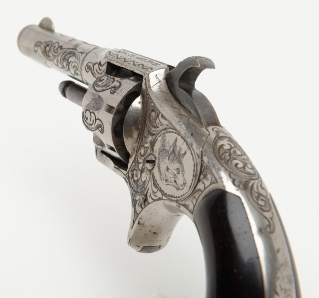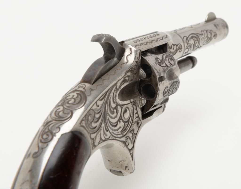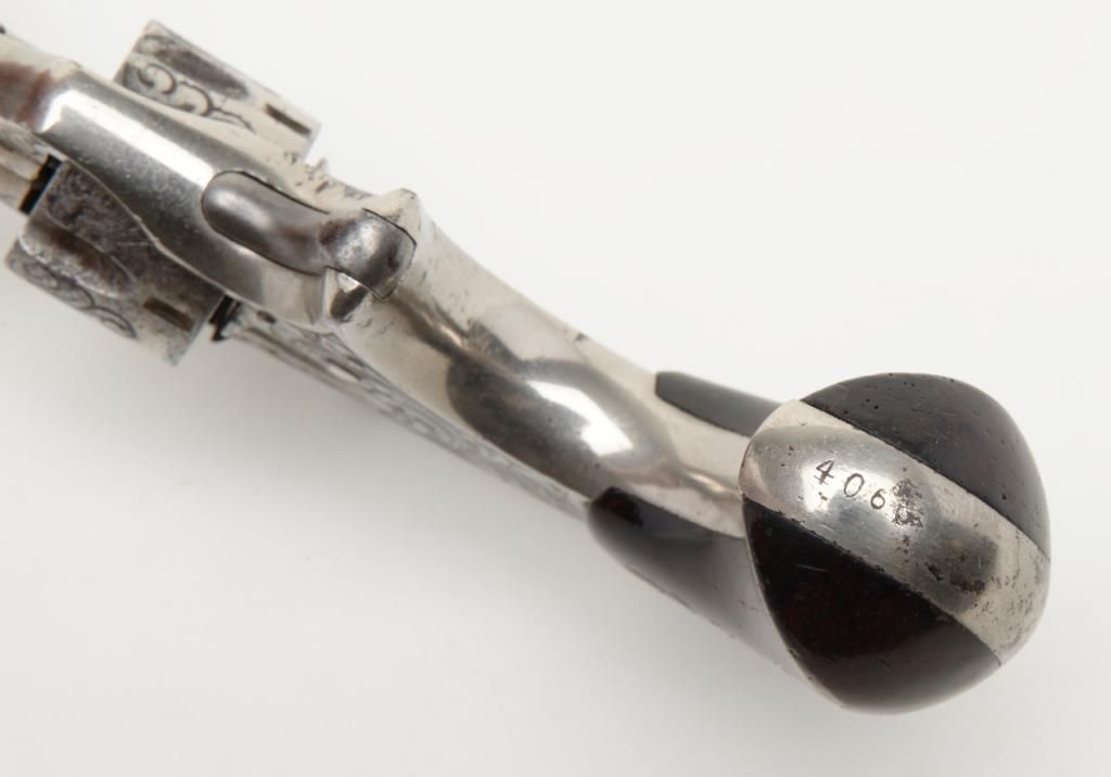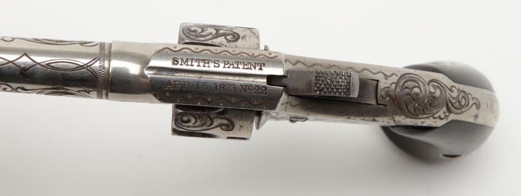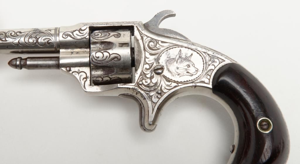 Deluxe engraved in New York style .22 caliber single action spur trigger revolver marked “Smith’s patent April 15, 1873 No. 22” on the top of the frame. The revolver shows a panel scene on the left side of the frame with a portrait of abobcat or a lynx. The revolver shows 85% to 95% original nickel with even loss of finish on the cylinder and muzzle and some just beginning pinprick pitting and erosion. The grips show 50% to 75% original varnish and are rosewood. Theaction works well and the interior is good. The pistol is numbered 4060 on the butt. Est.: $2750-$5500