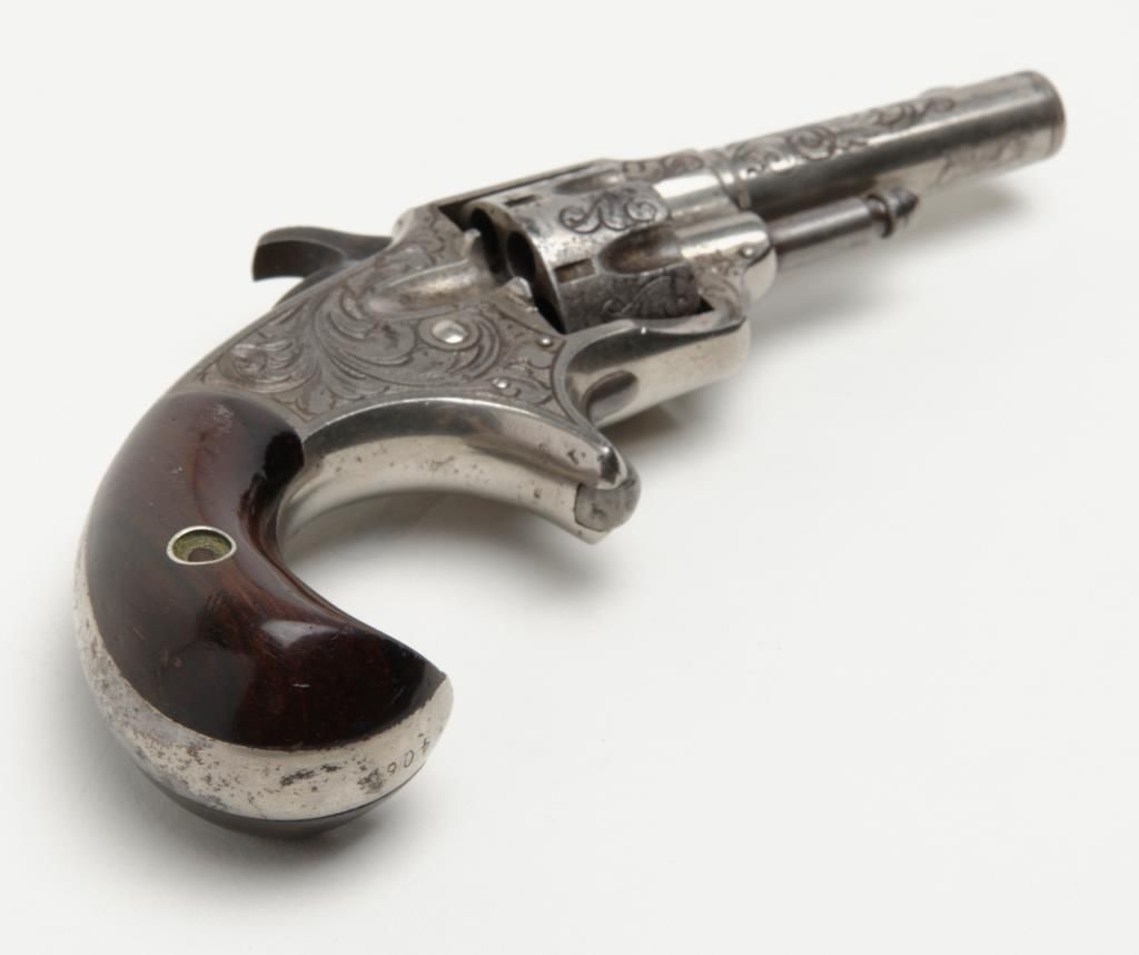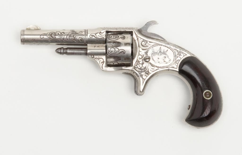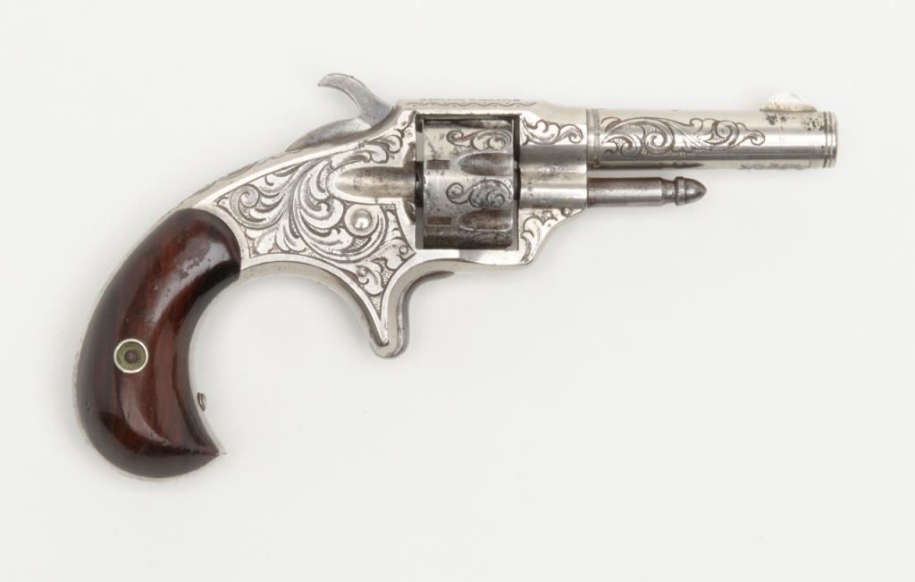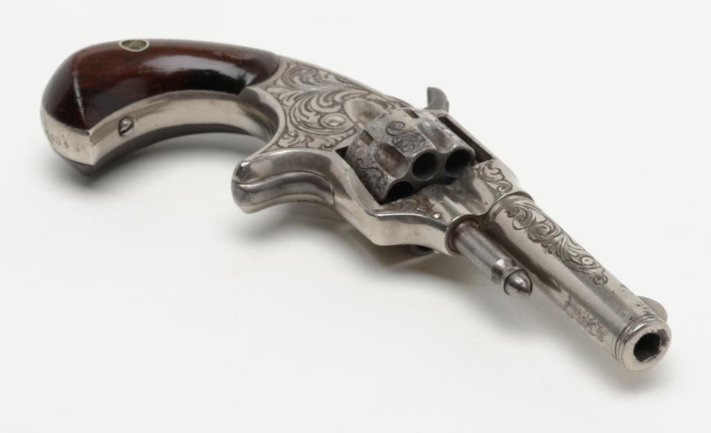 Deluxe engraved in New York style .22 caliber single action spur trigger revolver marked “Smith’s patent April 15, 1873 No. 22” on the top of the frame. The revolver shows a panel scene on the left side of the frame with a portrait of abobcat or a lynx. The revolver shows 85% to 95% original nickel with even loss of finish on the cylinder and muzzle and some just beginning pinprick pitting and erosion. The grips show 50% to 75% original varnish and are rosewood. Theaction works well and the interior is good. The pistol is numbered 4060 on the butt. Est.: $2750-$5500