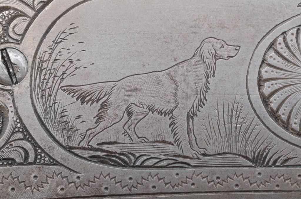 Deluxe factory engraved Marlin Model 1893 lever action rifle, .30-30 cal., takedown, 20” octagon barrel, blue and case hardened finish, ¾ magazine, deluxe checkered wood stocks, #163068. This gun is in overall finecondition showing the majority of its original blue finish on the Special Smokeless Steel-marked barrel; scattered areas of original case colors on the receiver, hammer, lever and crescent butt plate; crisp action, sharp markings, fine bore; extensive engraving on receiver, barrel at breech, fore end cap and butt plate including two finely accomplished panels scenes, one of a hunting dog on the right side of the frame and theother of a mountain lion on the left side; the wood is overall fine with better-than-standard graining and checkered diamond accenting to both sides of the butt stock wrist. A beautifully engraved deluxeMarlin accompanied by a folder with lots of information on the Model 1893 from Brophy’s book “Marlin Firearms, A History of the Guns and The Company that Made Them” including information on page 531 of the book that