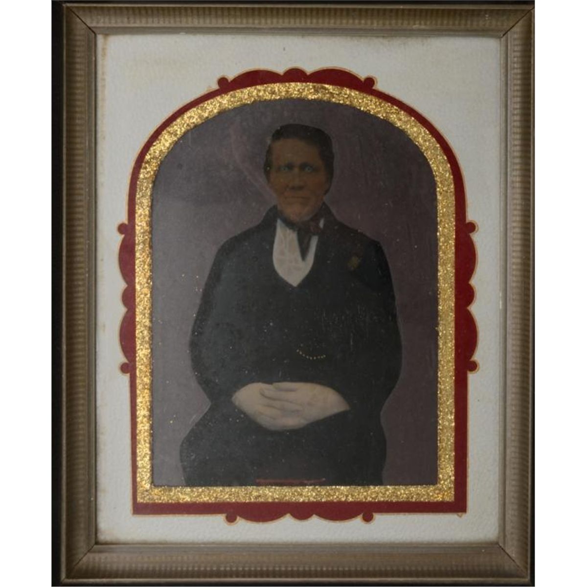 Deluxe period framed and ornately matted mid 1800’s Electrograph Portrait of a formal gentleman, approx. 14” x 12” overall and image size of approx. 7” x 5” in overall very good to fine condition with triple mattingand beautiful multi-layer wood frame; rear of original frame has original paper label indicating “Electrograph Portraits, The Finest And Most Durable In The World; Warranted To Last A Life Time; All Kinds ofSmall Pictures Enlarged, and Framed in Style that Surpasses all others”. A rare early large image. Est.: $200-$400.