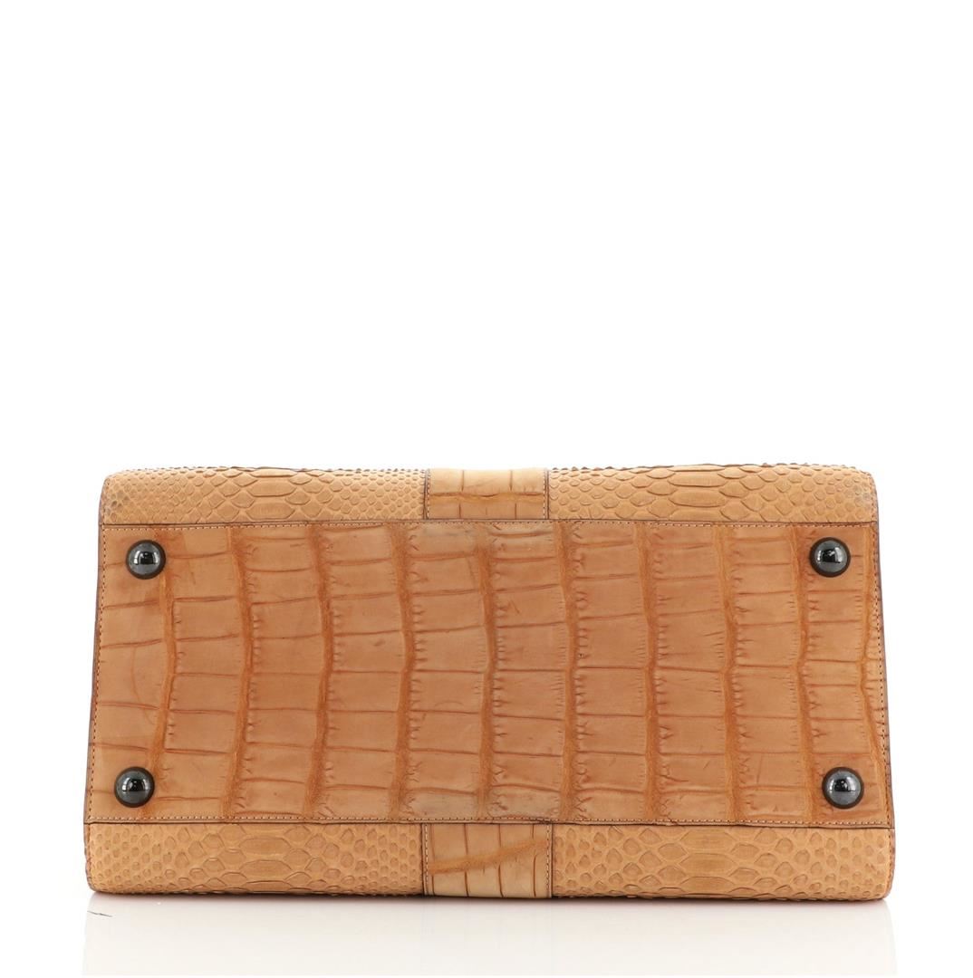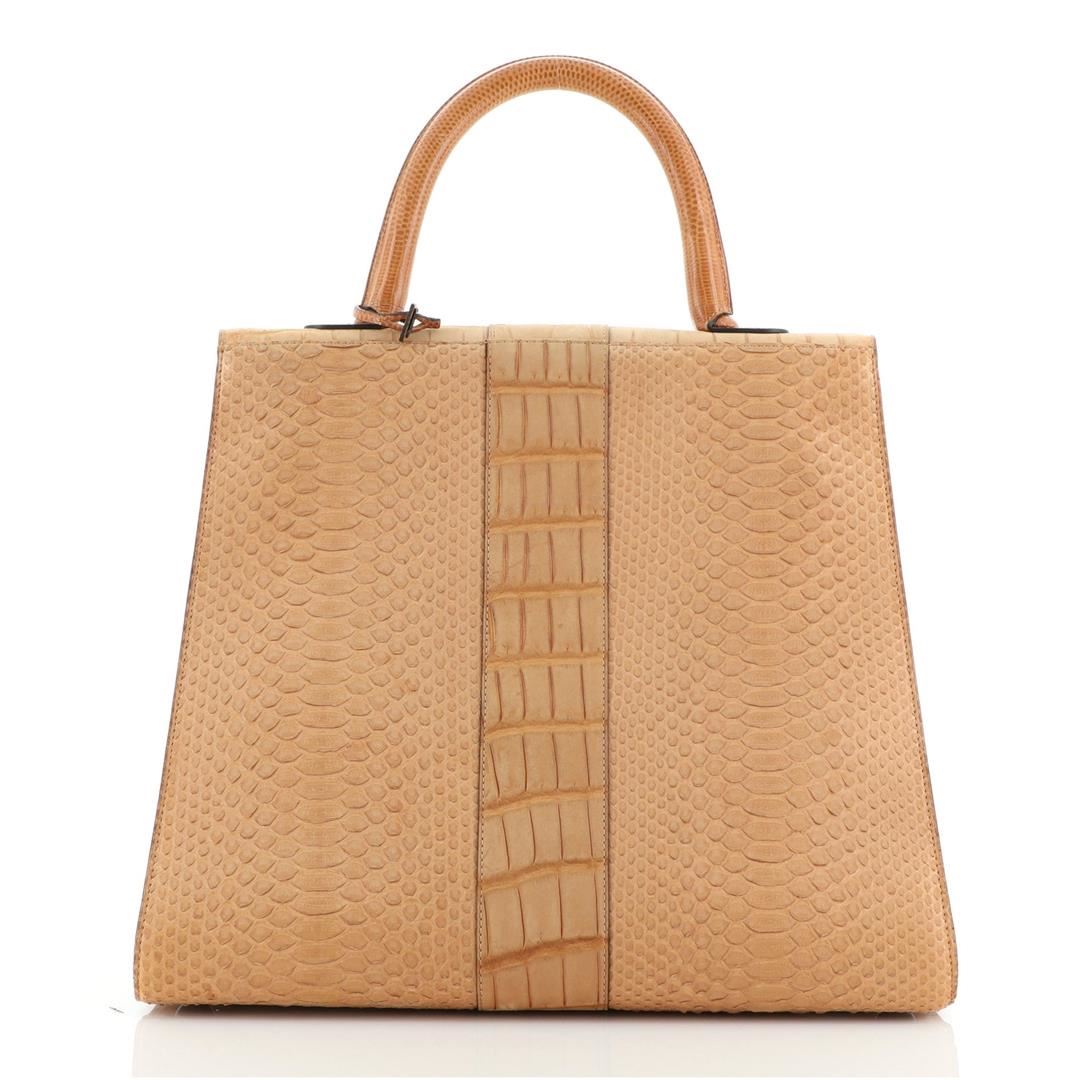 Delvaux Brilliant Top Handle Bag Mixed Exotics GM Brown Condition Details: Moderate darkening on flap, scuffs on exterior and in interior, minor splitting on opening flap wax edges. Bubbling underneath flap, indentations in interior, scratches on hard