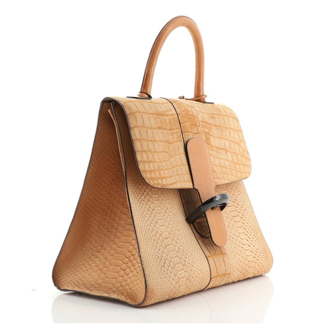 Delvaux Brilliant Top Handle Bag Mixed Exotics GM Brown Condition Details: Moderate darkening on flap, scuffs on exterior and in interior, minor splitting on opening flap wax edges. Bubbling underneath flap, indentations in interior, scratches on hard