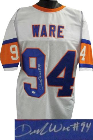 DeMarcus Ware was drafted by the Dallas Cowboys with the 11th overall pick in the 2005 NFL Draft out of Troy University. He has been selected to seven Pro Bowls and has led the NFL in sacks twice. On March 12, 2014, one day following his release from the Cowboys, Ware signed a three-year, $30 million contract with the Denver Broncos. The deal includes $20 million in guaranteed money. DeMarcus Ware has hand signed this Denver Broncos White TB 75th Anniversary Prostyle Jersey. JSA Hologram and Certificate of Authenticity.