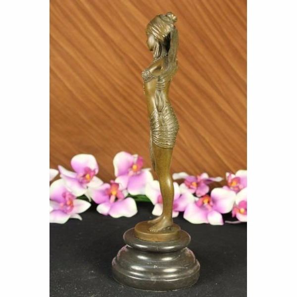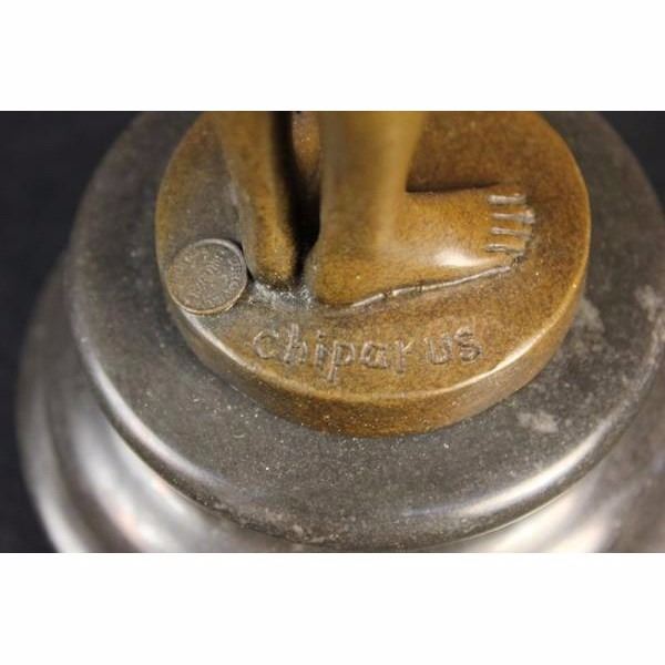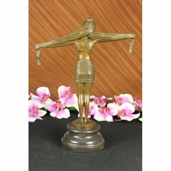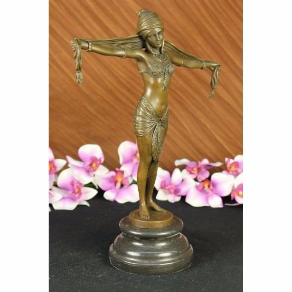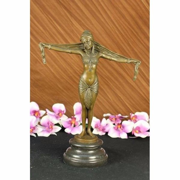 The belly dancer takes the floor and strikes her opening pose. Shewraps a scarf around her head and holds the long ends out to her side.She tilts her head to the side and shuts her eyes, waiting for thebeat to begin. Her arms are out stretched wide as she holds on to herscarf letting the ends dangle from her hands.This gorgeous Gypsyperforms her classic belly dance, letting strangers fall in love withthe sight of her. Her curvaceous body is astounding and her outfitshows it off beautifully. Her beaded top holds up her perky breastsand a sash is tightly wrapped around her curvy hips. She has gorgeousdetails from the scarf that wraps around her head to the tassel thatfalls on to her stomach. 100% bronze and handmade, this brown patinasculpture was cast using the "Lost Wax Method" and mounted on a marblebase and is signed Chiparus Condition: This sculpture is in perfect condition. Bronze Dimensions with Marble Base:Height 13" x Width 9" Marble Dimensions: Diameter 4" Height without base: 12" Weight : 7 LBS Inventory : 28DS123B3082