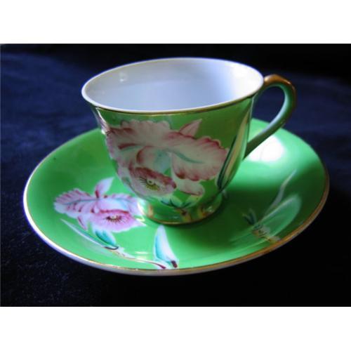 This is a beuatiful little cup and saucer, in a cheerful lime green with pink orchids on both the cup and the suacer. Each piece is trimmed in gold, which is in excellent condition. On the bottom of both pieces, in gold, is "Made in Occupied Japan." The handpainted flowers are detailed and nicely rendered. I note no chips or cracks or wear.