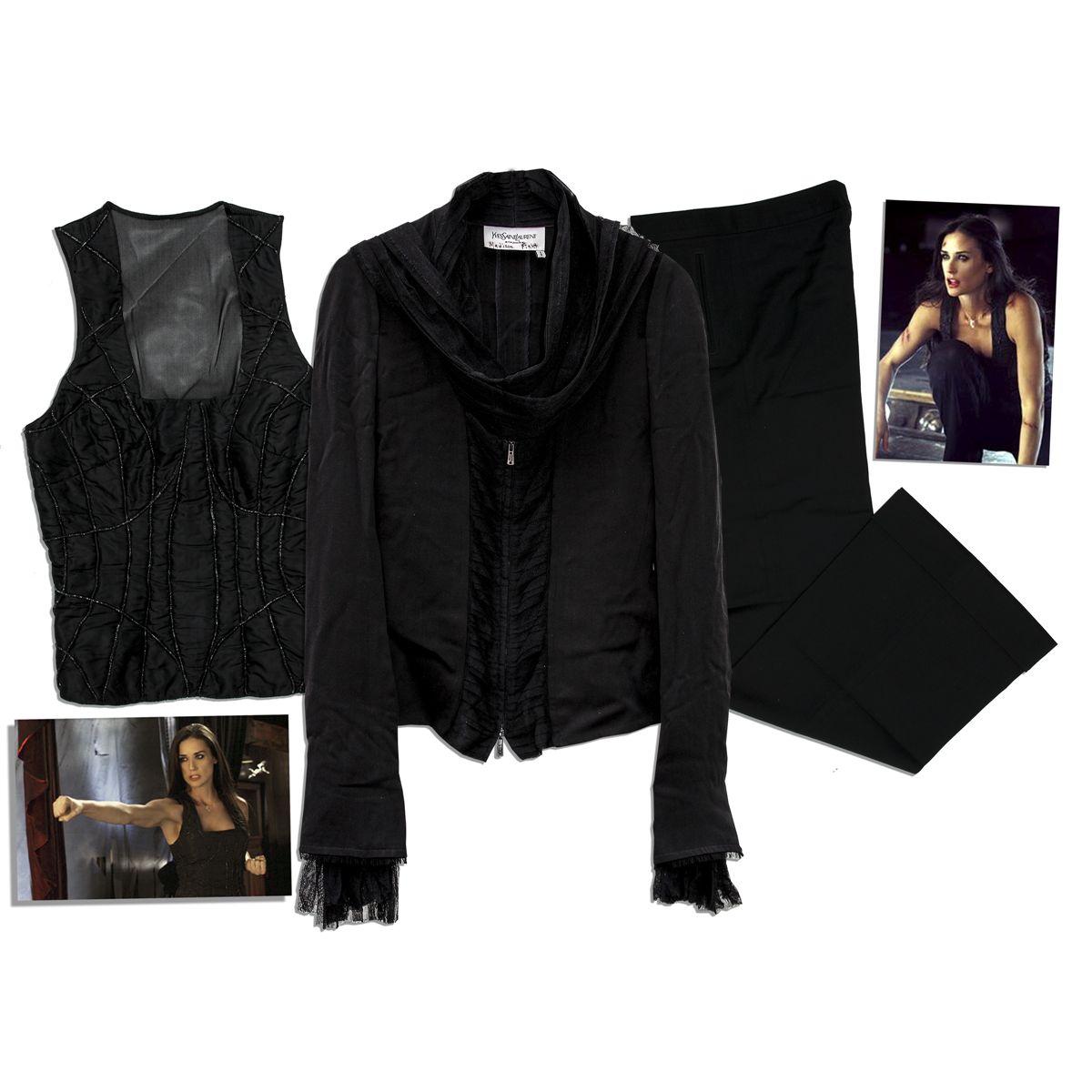 Demi Moore screen-worn costume from ''Charlie's Angels: Full Throttle''. In this 2003 sequel to the successful franchise, Moore played Madison Lee, a villain in the film. Full costume is depicted in one of the final battle scenes of the film and includes: (1) a custom-tailored black quilted vest with a stretch mesh net back, with a ''Demi / Hero #1'' handwritten tag, measures 14'' x 21''; (2) an Yves Saint Laurent brand black blouse, custom tailored with an attached pleated scarf and matching ruffle sleeves, and with ''Madison fight'' handwritten to tag, measures 14'' x 27''; (3) a pair of wide-leg black pants with a ''Demi 2'' handwritten to tag, 26'' x 32''. Includes original wardrobe tags and a Reel Clothes COA. Near fine condition.