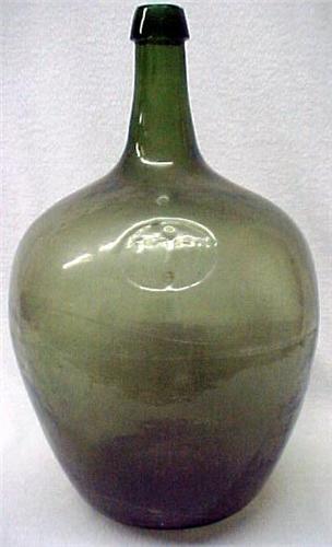 Demijohn bottle; olive green; open pontil; applied collar (small chip); sloping shoulder with oval cartouche 1750; 20" Estimate 60/120"