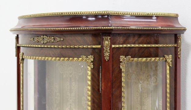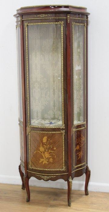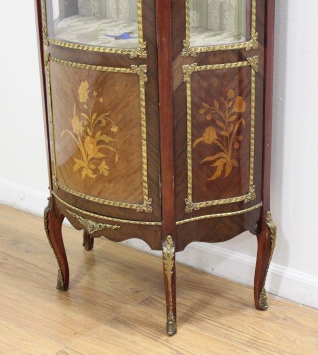 Tulip and satinwood. Bronze mounts. Curved glass sides. Plexiglass center. Approx. 65" H x 26" W x 13 1/2" D. Missing shelves.