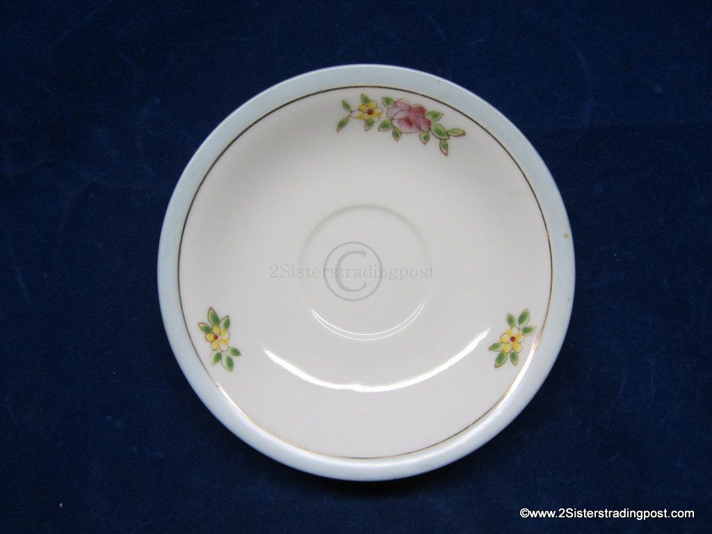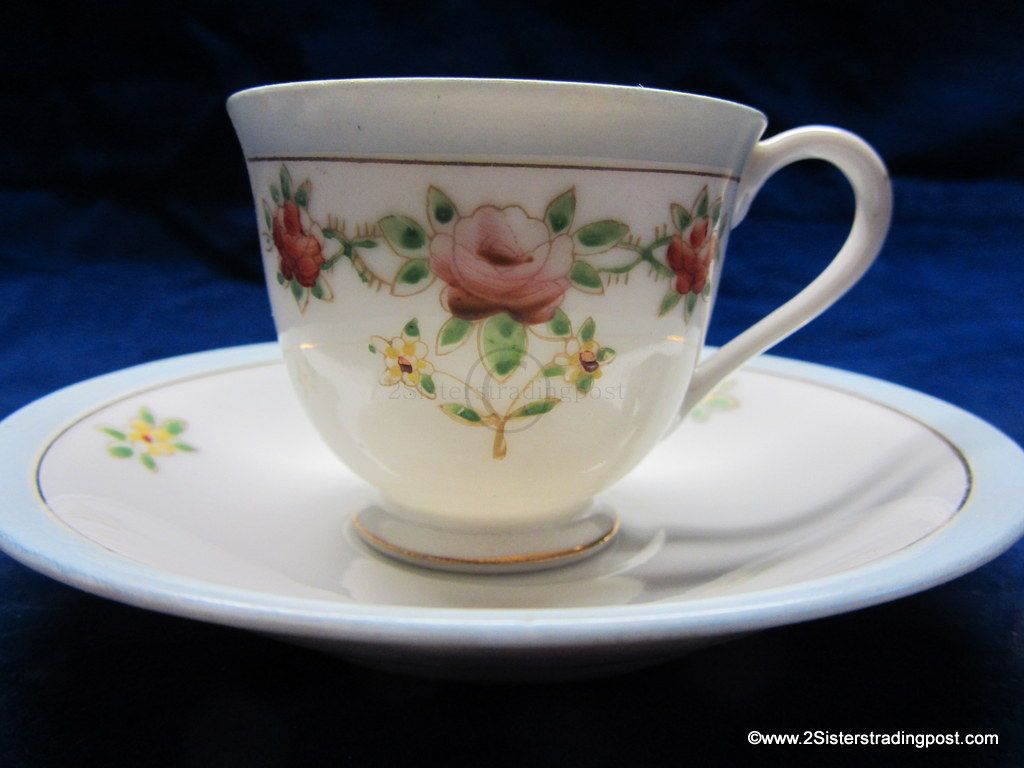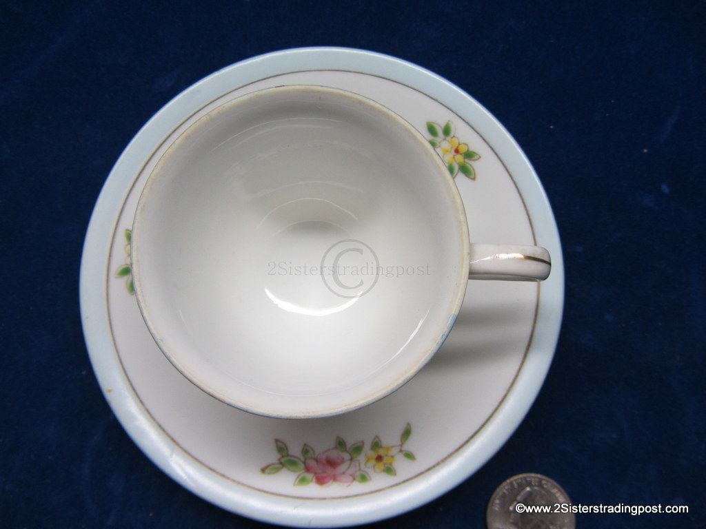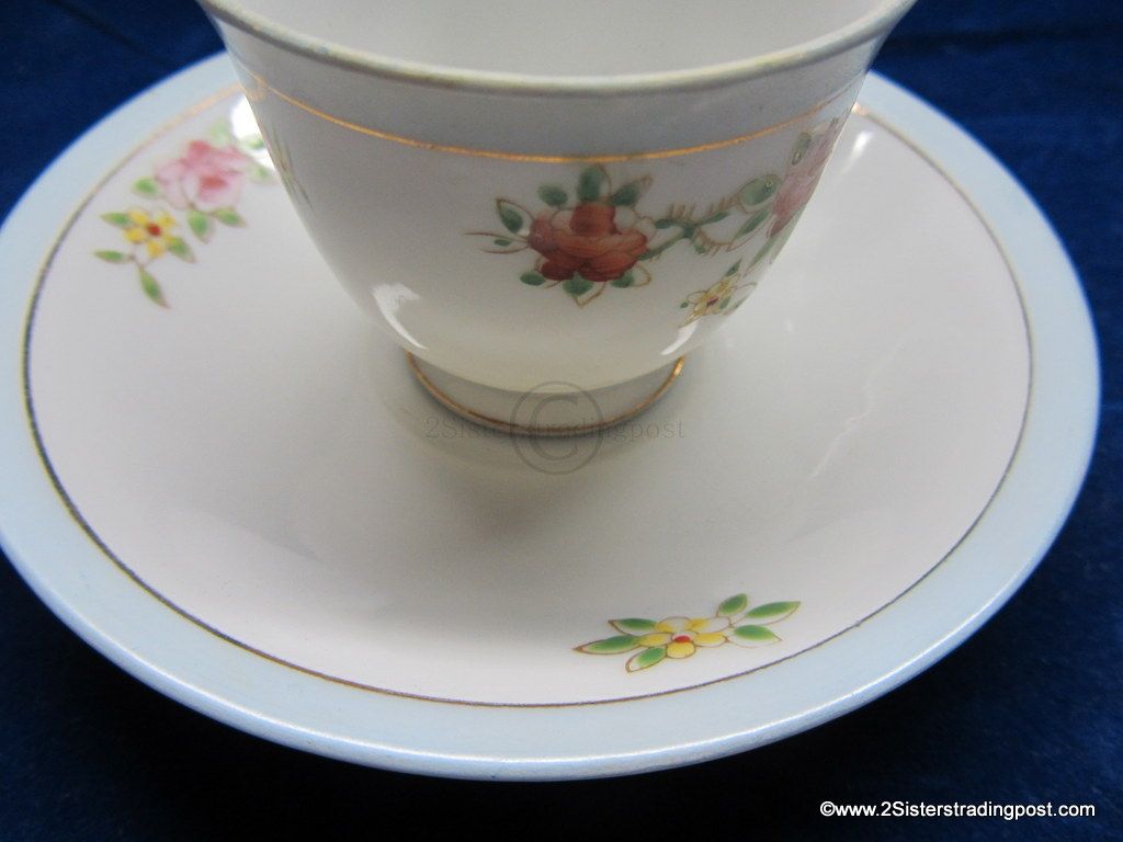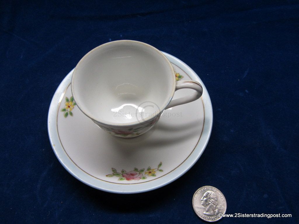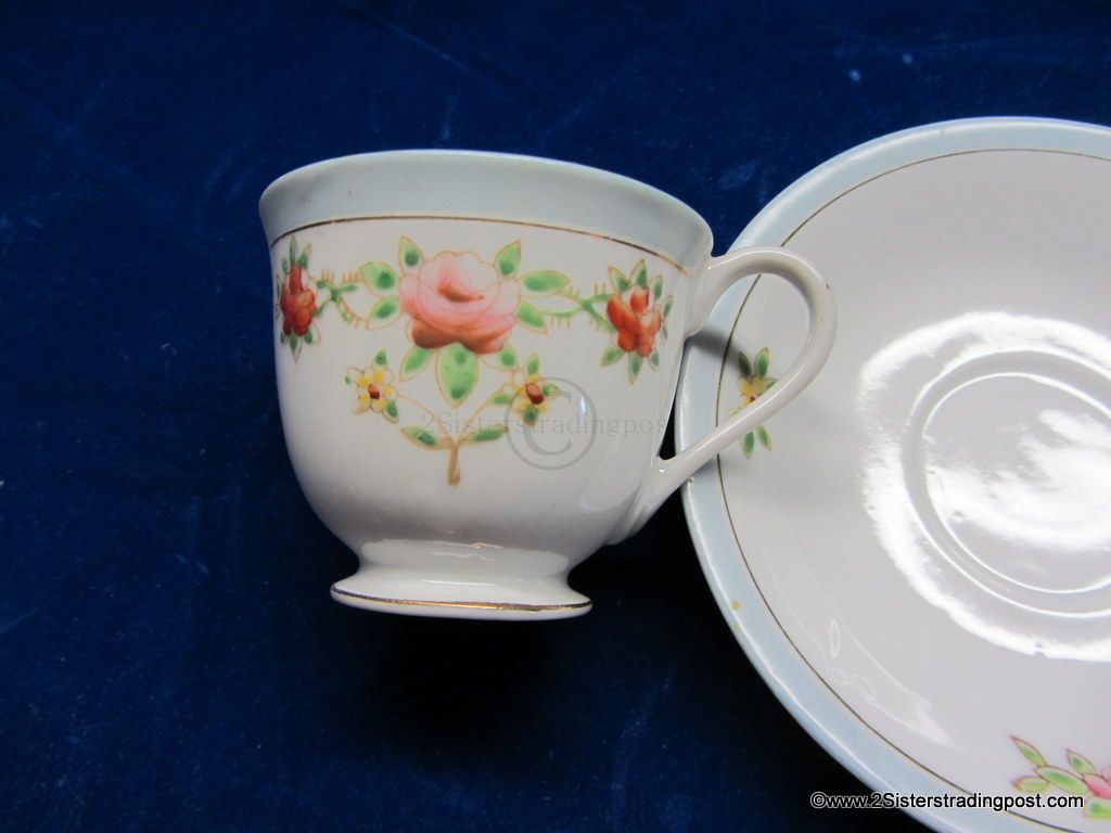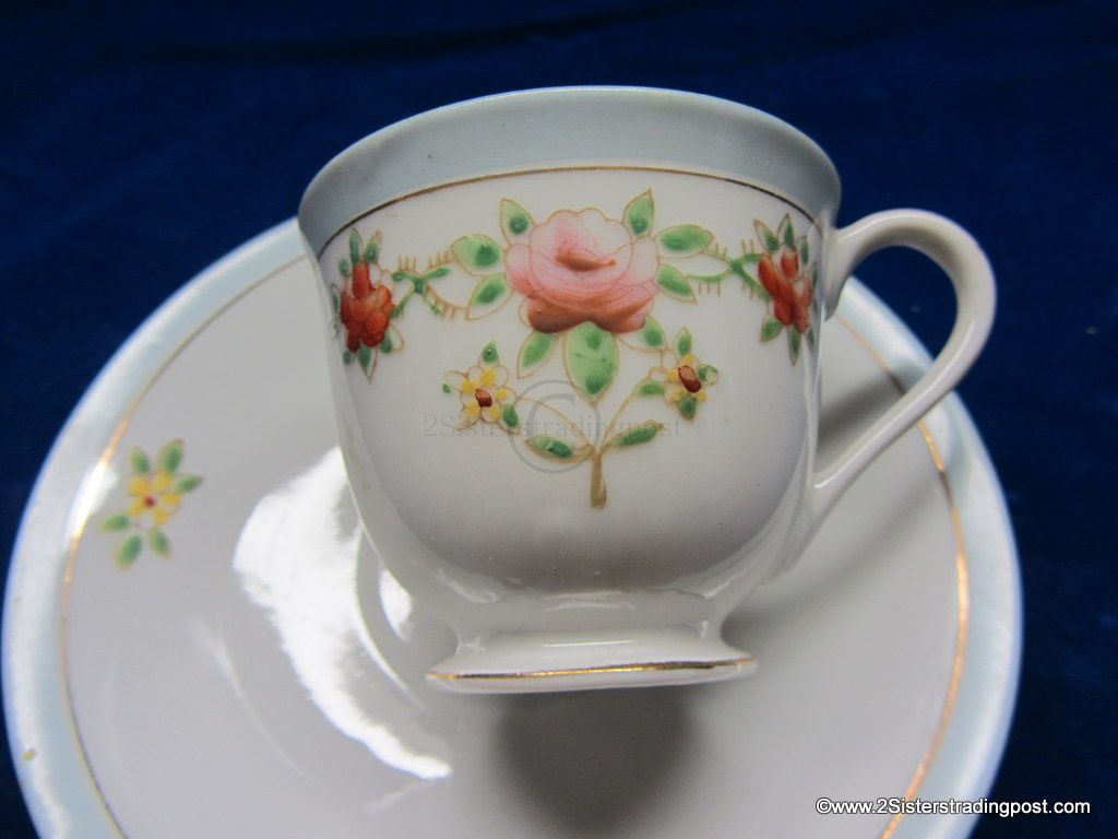 Demitasse cup & saucer has a delicate red roses design, with yellow floral accent. The cup and saucer alike, is white with light blue edging, a fine line of gold separates the two colors. Stamped on both cup & saucer 'Made in Occupied Japan' dating this piece between 1945-1952 Measurements cup 2.25" tall x 3.25" including handle 2.5" without handle, saucer is 4.75" across. SHIPPING: Available