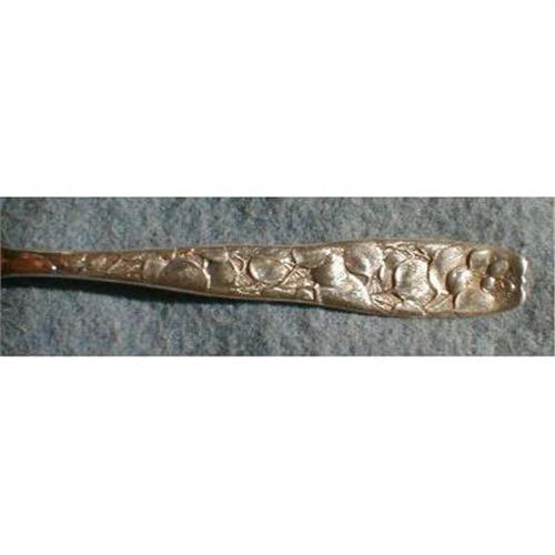 Very pretty little antique demitasse sterling silver spoon in an unidentified pattern. It appears to be lotus buds, quite realistically modeled, over an intricate background of Hindu bent crosses and a stylized chrysanthemum. This is very much in the Japanese aesthetic idiom.