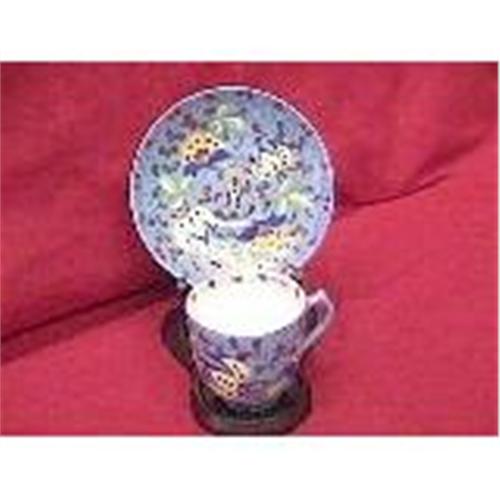 This is a straight-sided cup, loop handle with thumb rest. Colorful Japanese decoration on bright blue ground. Beehive mark, C-1900's