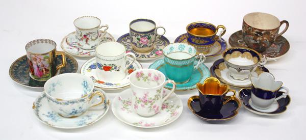 Twelve Continental polychromed or gilt enameled porcelain demitasse cups and saucers by Dresden, Limoges, Royal Doulton, Vienna, etc.
