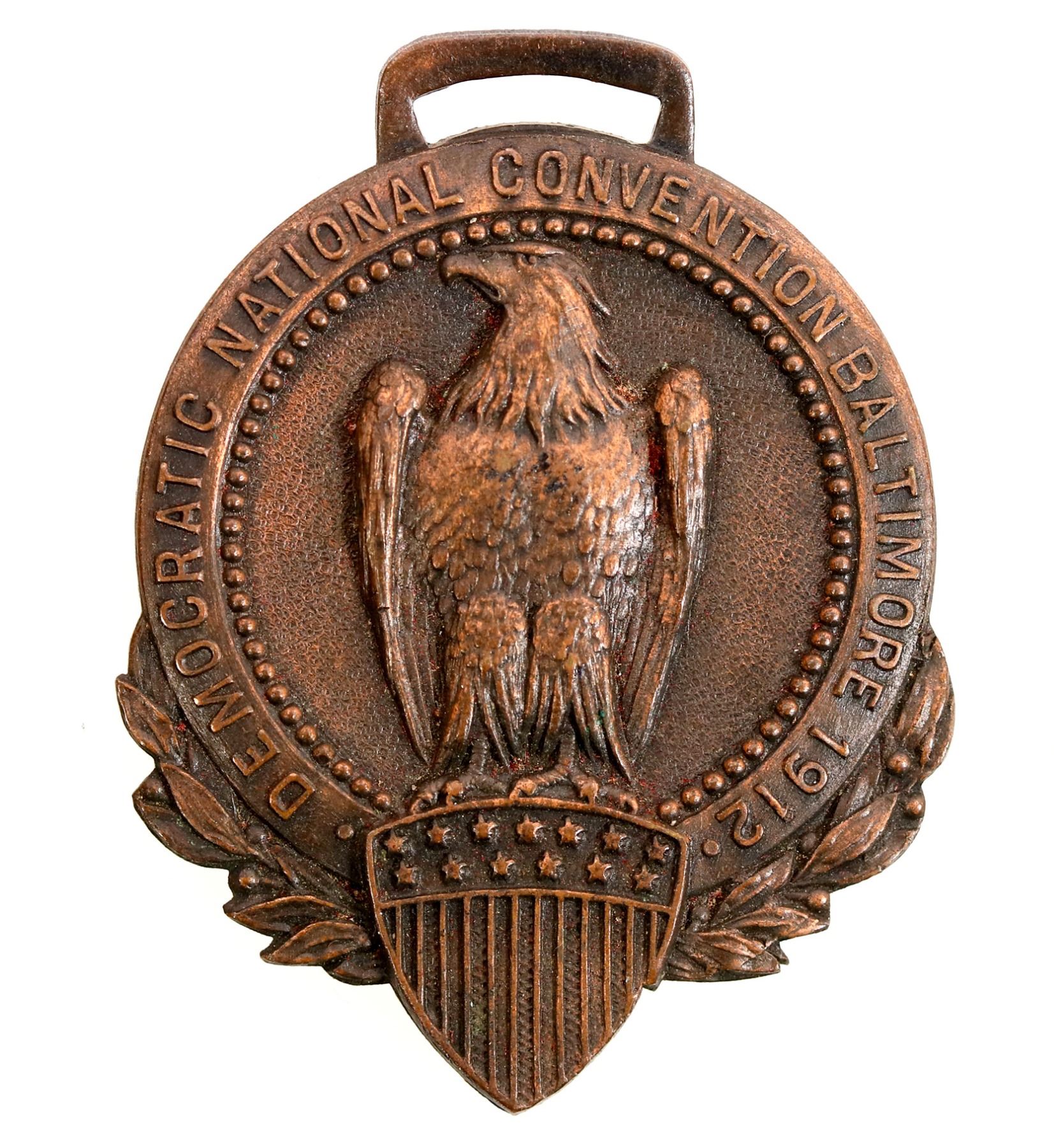 New Jersey Governor Woodrow Wilson & Thomas R. Marshall of Indiana were the candidates the Democrats elected in 1912 at the Baltimore Democratic convention. 39 x 51 mm; made by Whitehead & Hoag.