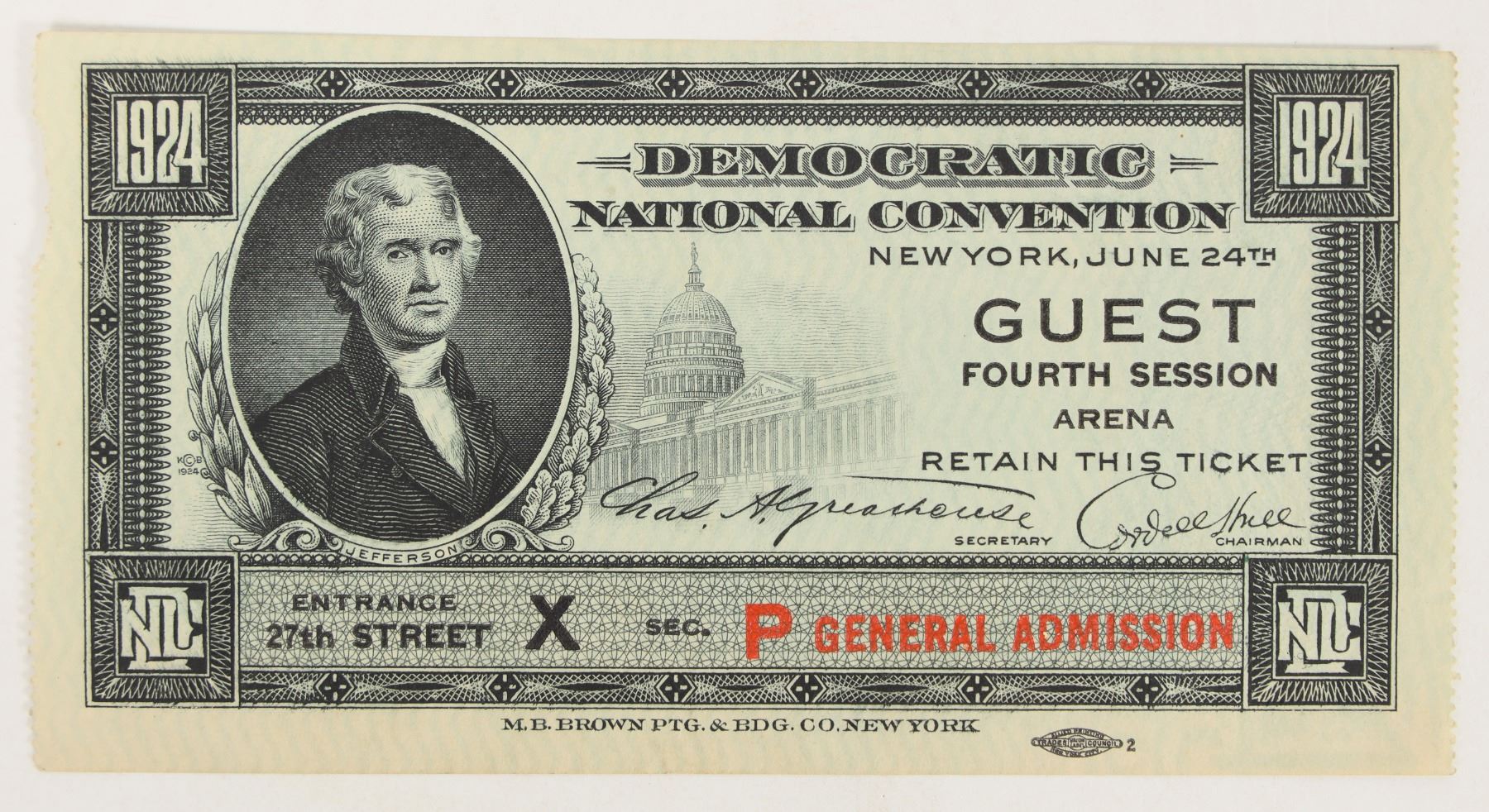 Democratic National Convention Ticket 1924. Guest , fourth session , arena. June 24, 1924, Madison Square Garden, New York . Longest continuously running convention in United States political history. EF condition.
