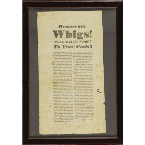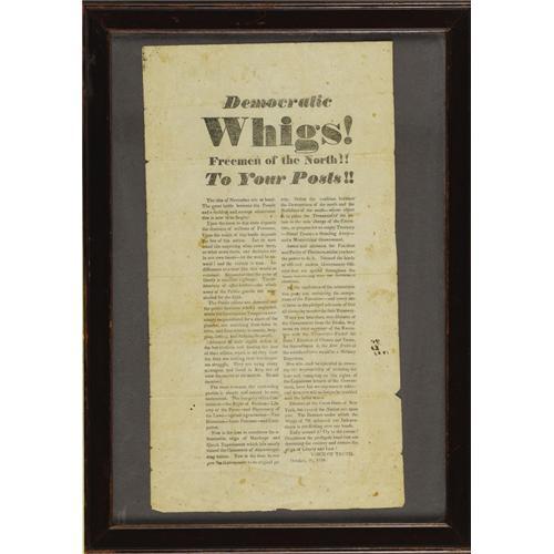 <B>"Democratic Whigs!" 1836 Broadside.</B></I> This broadside measures 13.25" x 7" and is possibly laid down (we did not remove this from the frame) under glass in an old wooden frame to an overall size of 16" x 11.5". Normal folds, and some scattered foxing; and a faint overall tone. Despite a few edge chips, this is a well-preserved and intact broadside with great political content. In part, "The issue between the contending parties is simple and cannot be misunderstood. The Integrity of the Constitution - the Right of Petition - Liberty of the Press - and Supremacy of the Laws - against Agrarianism - Van Burenism - Loco Focoism - and Usurpation. Now is the time to overflow the abominable right of Humbugs and Quack Experiments which has nearly ruined the Commerce of this enterprising nation. Now is the time to restore Government to its original purity. Defeat the coalition between the Destructives of the north and the Nullifiers of the south - whose object is to place the Treasures of the nation in the sole charge of the Executive, or prepare for an empty Treasury - Direct Taxes - a Standing Army - and a Monarchial Government."