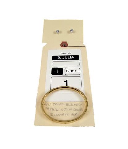 Demolition (2016) - Julia (Heather Lind) screen worn, hero, maroon with black chiffon piping long sleeve button front 'Vince' blouse with small stain in the back, (size S) faux gold chain with encrusted solitaire 'Donna Sackowitz' necklace, cubic zircon stud 'Lord + Taylor' earrings, faux gold 'Donna Sackowitz' Cartier style 'Donna Sackowitz' bracelet, black pencil with zipper in the back 'Body by Victoria' skirt, (size 4) and black suede stiletto 'Ivanka Trump' heels. (size 7M) Includes wardrobe tag.