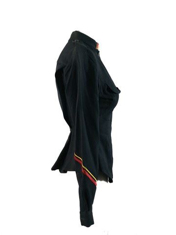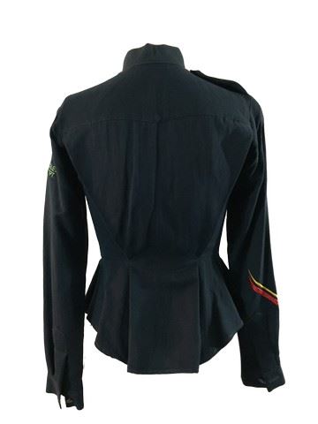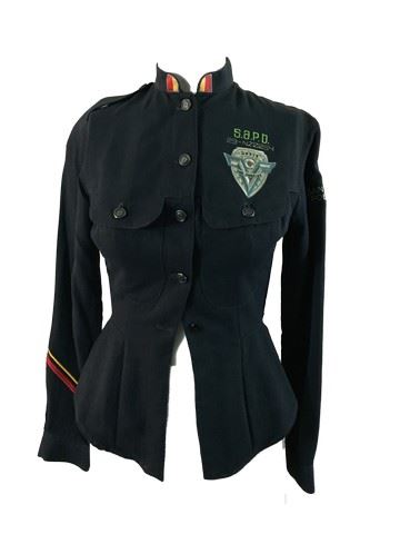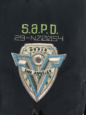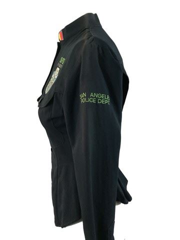 Demolition Man (1993) - Female background character, Navy blue cotton button-down police style shirt, two chest pockets on left and right side, yellow ,red and white stripes on collar, yellow and red stripes on right sleeve, blue and silver police badge patch on left side of the chest, S.A.P.D with 29-NZ0054 embroidered above police badge, San Angeles Police Dept. embroidered on left side of the shoulder. flared down at waist. This incredible memorabilia comes direct from the Debbie Reynold's archive collection. Debbie Reynolds and Todd Fischer purchased and acquired this amazing collection decades ago from the MGM auction, 20th Century Props auctions, Christie's auctions, Planet Hollywood and numerous additional auctions. Debbie Reynolds then opened Hollywood Central Props where many of these props and costumes were used in the making of feature films and television shows. This auction also marks the beginning of a long-term collaboration with The Debbie Reynolds’ Archives and her son Todd Fisher with a collection of props, costumes and photos including an ensemble from CHOCOLAT, ROMEO AND JULIET, MISSISSIPPI, V FOR VENDETTA, THE PATRIOT, THE LAST SAMURAI and more!