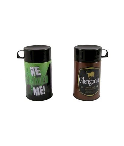 Screen used, hero, brown and black 'Glengoolie' Single Malt Scotch Whisky thin metal thermos and 'Ghostbusters' thin metal thermos. (approx. 6 1/2" tall)