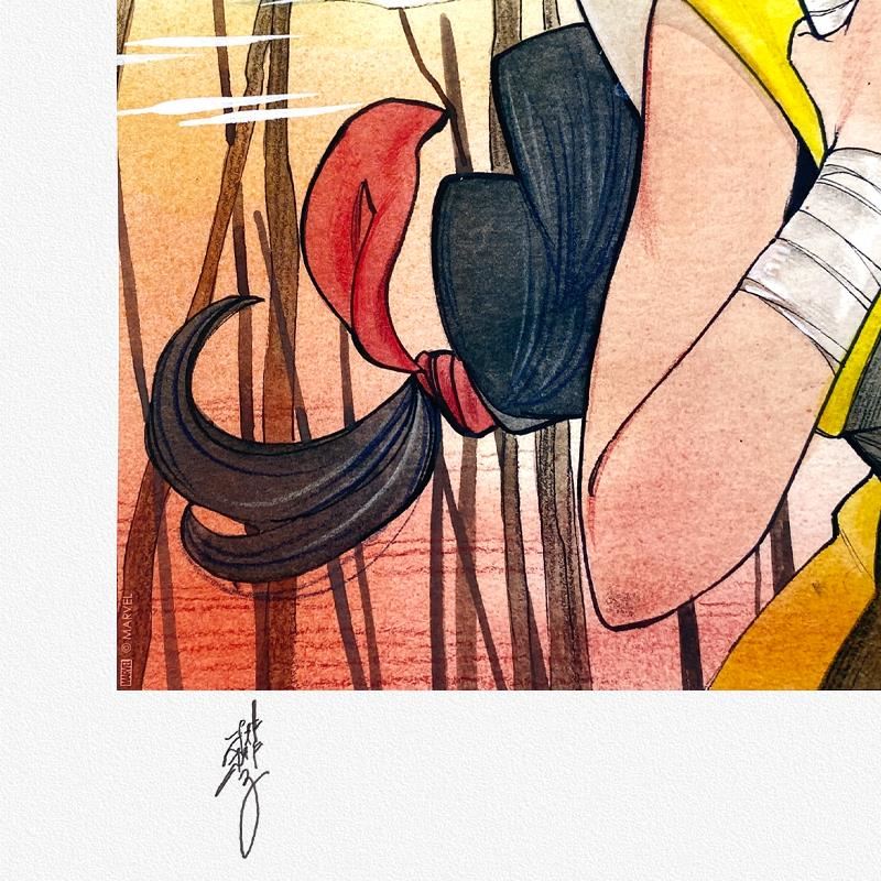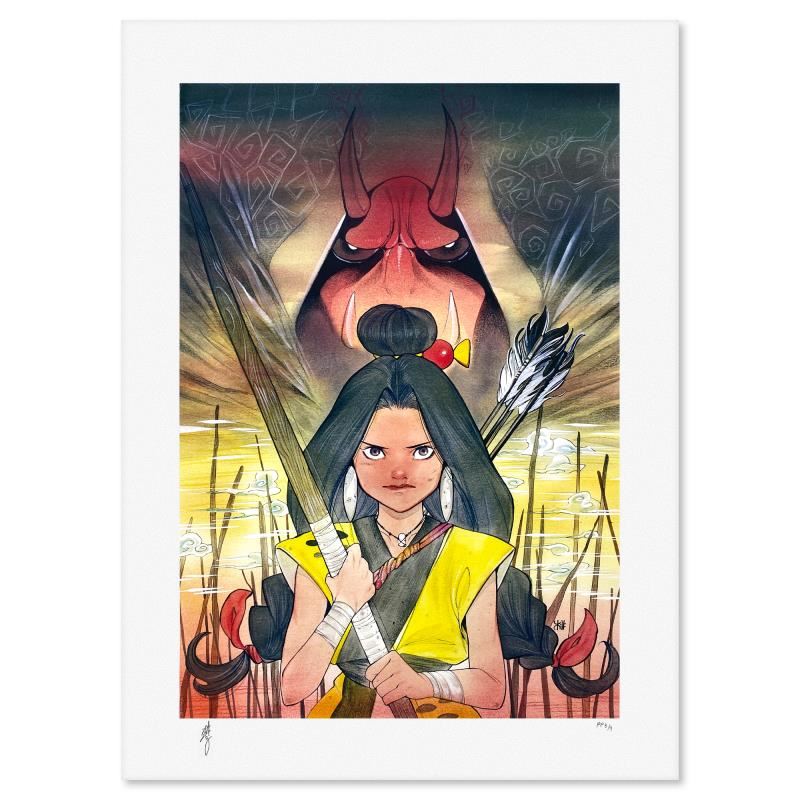 "Demon Days: Moonstar & Red Hulk" is a limited edition giclee on paper from Marvel Comics and Peach Momoko, PP numbered 3/4 and bearing the authorized signature of the artist. Includes Letter of Authenticity. Measures approx. 24" x 18" (border) 20" x 14" (image).