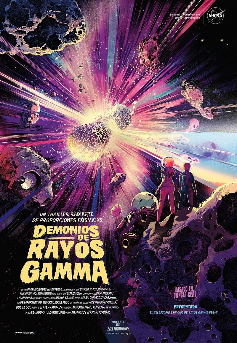 English: In the depths of the universe, the cores of two collapsing stars violently merge to emit an explosion of the deadliest and most powerful form of light known as gamma rays. These catastrophic beams attack their unfortunate surroundings, shining a trillion times more powerfully than the Sun for 30 terrifying seconds. No spaceship will protect you from the blinding destruction of the gamma ray demons!