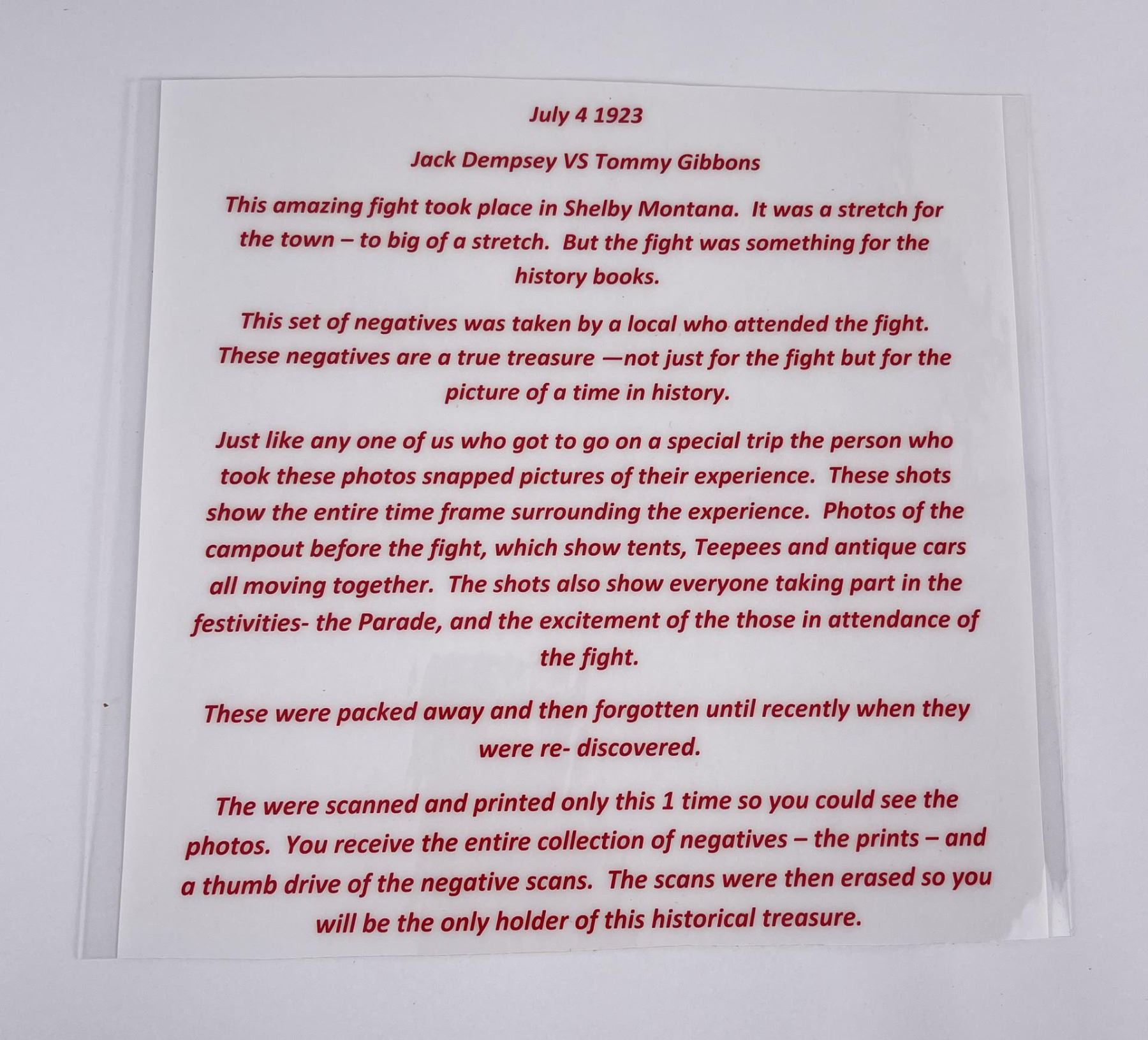 Truly phenomenal historical archive in relation to the Jack Dempsey and Tommy Gibbons fight that took place July 4th 1923 in Shelby Montana. Includes 22 Never Before Seen Photo Negatives. This is a stunning and once in a lifetime opportunity.