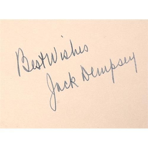 <Our item number 140788><B>Dempsey, Jack.</B> (1895-1983) World heavyweight boxing champion from 1919-1926. Signature and Inscription ("Best Wishes / Jack Dempsey") on a 4x5 in. card, n.p., n.d. Blue ink on cream card stock. Minor soiling, else fine. <BR>Estimated Value $75 - 100. <BR><BR>Our item number 140788<BR><IMAGES><P ALIGN="CENTER"><IMG SRC="http://www.goldbergcoins.net/liveauction/49jpegs/140788.jpg"> </P></IMAGES>