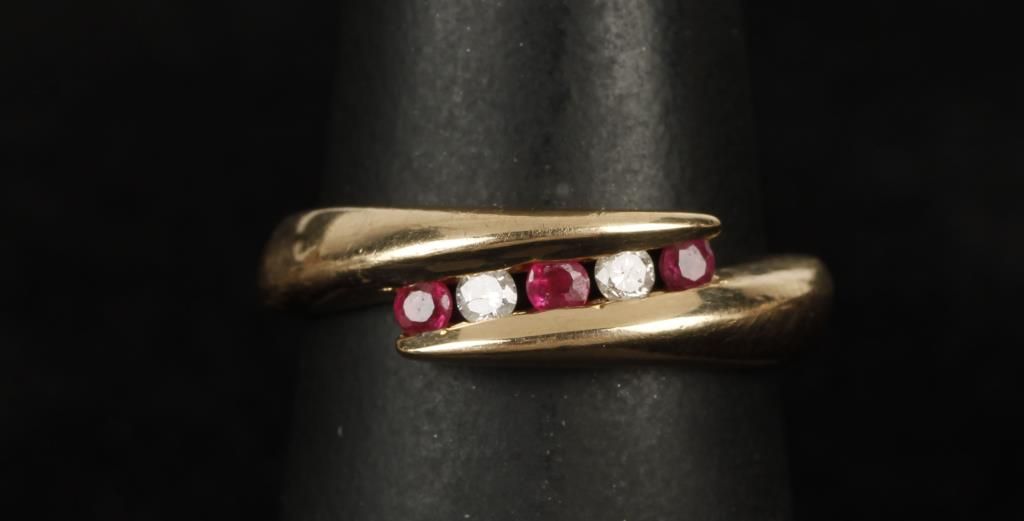 The ring features 3 rubies and 2 diamonds, all channel set in a bypass design. The gems total about 0.5 cttw. The ring is size 4.75 and weighs 2.3 grams. A great picky ring.