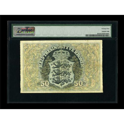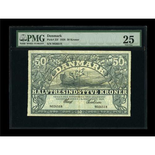 <B>Denmark</B></I> National Bank Copenhagen 50 Kroner 1926 Pick 22f<BR> This denomination with an always popular fishing vignette is quite scarce. A complete well margined example grades <B>PMG Very Fine 25.</B></I><BR><BR><b>Shipping:</b> Coins & Currency (<a target="_blank" href="http://www.heritageauctions.com/common/shipping.php">view shipping information</a>)