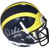 Denard Robinson was the starting quarterback in all 26 games for the 2010 and 2011 Michigan Wolverines football teams and played at the same position as a senior for the 2012 team as well as running back and receiver towards the end of the season. As a sophomore in 2010, Robinson set the single-season Division I FBS record for rushing yards by a quarterback and became the only player in NCAA history to both pass and rush for 1,500 yards. He was awarded the 2010 Chicago Tribune Silver Football as the Most Valuable Player in the Big Ten Conference and was selected by the Football Writers Association of America as a first-team All-American. As a senior in 2012, he extended his record with a third game with both 200 yards rushing and 200 yards passing. Denard Robinson has hand signed this Michigan Wolverines Schutt Authentic Mini Helmet. Private Signing, 4/21/2013, in Taylor, MI. Certificate of Authenticity from Athlon Sports.