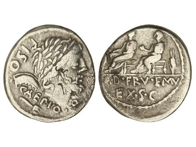 Denario. 100 a.C. CALPURNIA-5. L. Calpurnius Piso y Q. Sevilius Caepius. Anv.: Cabeza laureada de Saturno a derecha, detrás arpa, debajo símbolo. PISO. CAEPIO. Q. 3,70 grs. Marcas de cambista en anverso. Cal-301; FFC-226. MBC.