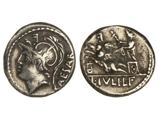 Denario. 103 a.C. JULIA-4a. L. Julius L. f. Caesar. Anv.: Cabeza de Marte a izquierda, encima letra invertida, detrás CAESAR. Rev.: Venus Genetrix en biga a izquierda, debajo lira, encima letra invertida. 4 grs. Cal-632; FFC-765. MBC.