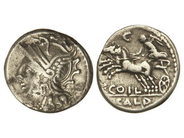 Denario. 104 a.C. COELIA-2. C. Coelius Caldus. Rev.: Victoria en biga a izquierda, encima letra, debajo C. COIL. En exergo: CALD. 3,90 grs. (Pequeñas oxidaciones en canto de anverso). Cal-441; FFC-574. MBC+/MBC.