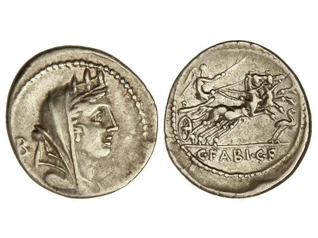 Denario. 104 a.C. FABIA-15. C. Fabius C. f. Hadrianus. Anv.: Cabeza de Cibeles a derecha, detrás letra B. 4 grs. Cal-574; FFC-702. MBC.