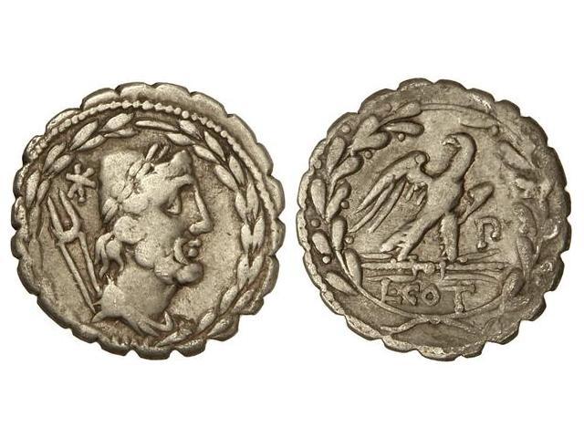 Denario. 105 a.C. AURELIA-21b. Lucius Aurelis Cotta. Anv.: Busto de Vulcano a derecha, detrás tenazas y estrella, rodeado por corona de laurel. Cal-260; FFC-189. MBC7MBC-.