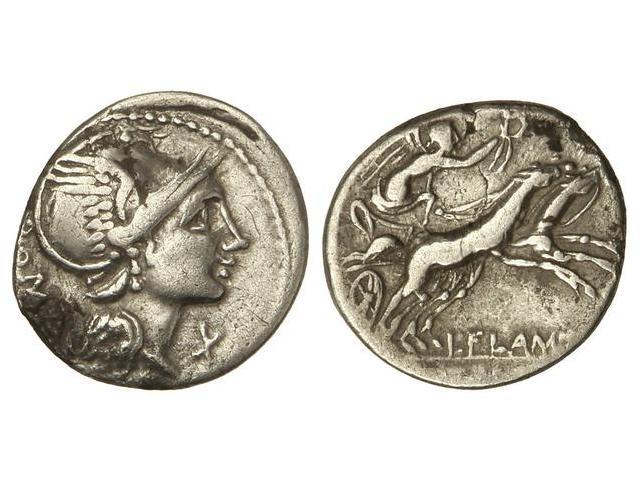 Denario. 109-108 a.C. FLAMINIA-1. Lucius Flaminius Cilo. Rev.: Victoria con corona en biga a derecha, debajo L. FLAMINI. En exergo: (CILO). 3,70 grs. (Pequeñas oxidaciones). Cal-579; FFC-708. MBC+/MBC.
