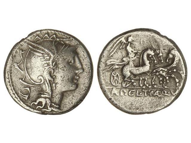 Denario. 110-109 a.C. CLAUDIA-2. Appius Claudius Pulcher. 3,80 grs. AR. (Golpecitos. Leves oxidaciones). Cal-423; FFC-564. (MBC).