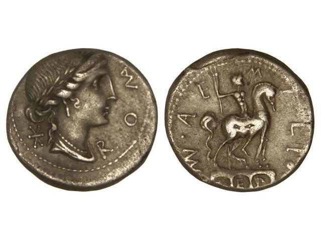 Denario. - 114-113 a.C. - AEMILIA-7. - Man. Aemilius Lepidus. - Rev.: Estatua ecuestre a derecha, sobre tres arcos, dentro de ellos (L)EP., alrededor M. N. AEMILIO. Cal-73; FFC-103. MBC/MBC-. - -
