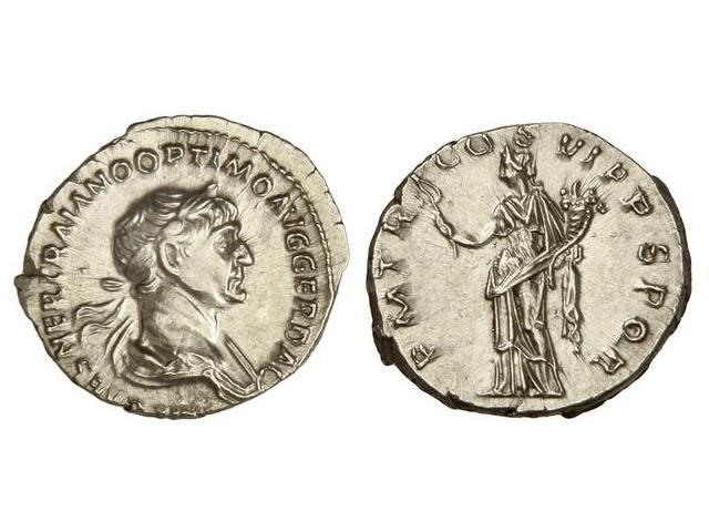 Denario. 114-117 d.C. TRAJANO. Anv.: Busto laureado a derecha. Rev.: Felicidad estante a izquierda portando caduceo y cornucopia. P. M. TR. P. COS. VI P. P. S. P. Q. R. 3,20 grs. AR. C-278.2. EBC.