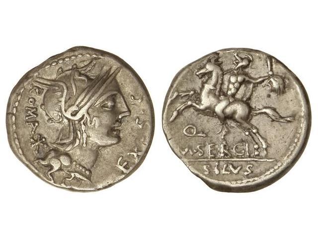 Denario. 116-115 a.C. SERGIA-1. M. Sergius Silus. Rev.: Jinete con espada a izquierda en el campo cabeza de galo, debajo Q/M SERGI. En exergo: SILVS. Cal-1271; FFC-1111. MBC+.