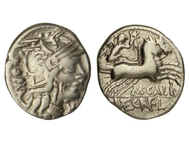 Denario. 117-116 a.C. CALIDIA-1. M. Calidius, Q. Caecilius y C. Fulvius. Rev.: Victoria con látigo en biga a derecha, debajo M. CALIO. En exergo: Q. MET. CN. FL. 3,80 grs. (Limpiada. Marca de cambista en anverso). Cal-298; FFC-223. MBC.