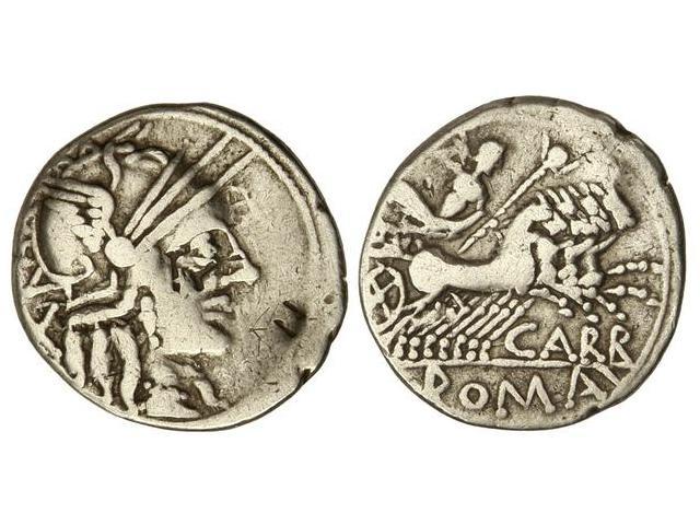 Denario. 122 a.C. PAPIRIA-7. Papirius Carbo. Rev.: Júpiter con cetro y rayos en cuadriga a derecha, debajo CARAB. En exergo: ROMA en tablilla. 3,90 grs. Marca de cambista en anverso. (Rayitas). Cal-1062; FFC-958. MBC-.