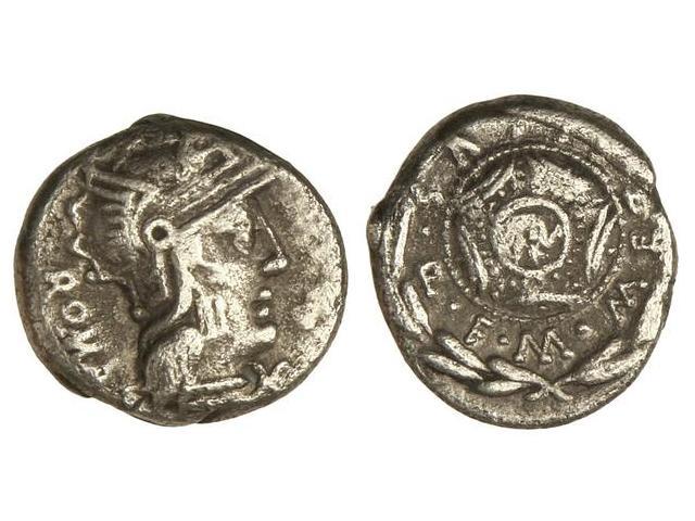 Denario. 127 a.C. CAECILIA-29a. M. Caecilius Metellus Q. F. Anv.: Cabeza de Roma a derecha, una estrella en la parte inferior trasera del casco, debajo la barbilla ¶, detrás ROMA de arriba hacia abajo. 3,60 grs. Cal-282; FFC-206. BC+.