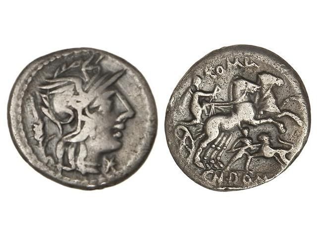Denario. 128 a.C. DOMITIA-14. C.n. Domitius Ahenobarbus. 3,64 grs. Cal-543; FFC-680. MBC.