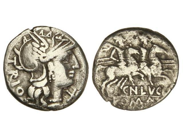 Denario. 136 a.C. LUCRETIA-1. Cnaeus Lucretius Trio. Anv.: Cabeza de Roma a derecha, delane X, detrás TRIO. 3,60 grs. Cal-910; FFC-822. MBC/MBC-.