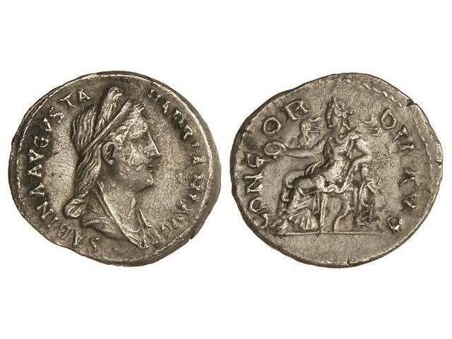 Denario. 137 d.C. SABINA. Anv.: SABINA AVGVSTA HADRIANI AVG. P. P. Busto diademado a derecha. Rev.: CONCORDIA AVG. Concordia sentada a izquierda. C-12. MBC+/EBC-.