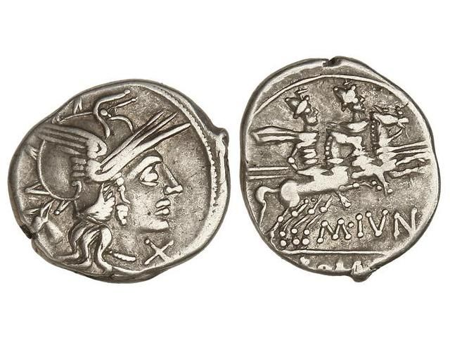 Denario. 145 a.C. JUNIA-8. M. Junius Silanus. 3,90 grs. AR. Cal-8; FFC-778. (MBC+).