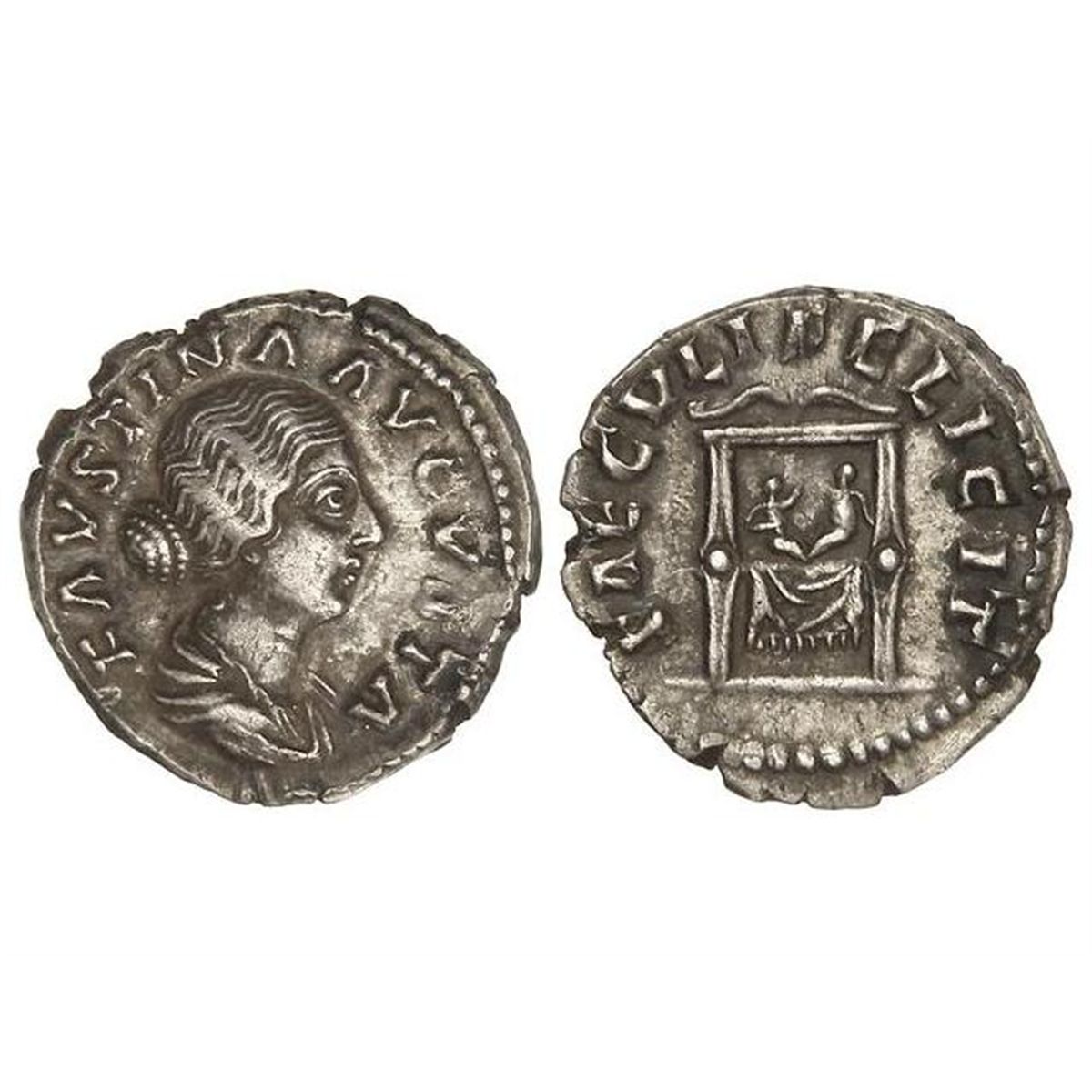 Denario. - 175 d.C. - FAUSTINA HIJA. - Anv.: FAVSTINA AVGVSTA. Busto a derecha. Rev.: SACVLI DELICIT. Trono con dos bebes. Pátina. C-190. MBC+. - -