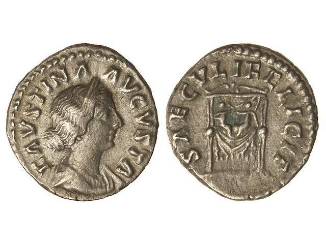 Denario. 175 d.C. FAUSTINA HIJA. Anv.: FAVSTINA AVGVSTA. Busto a derecha. Rev.: SAECVLI FELICIT. Dos niños en un trono. C-190. MBC+.