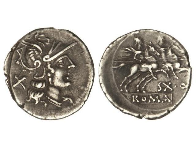 Denario. 189-180 a.C. QUINCTILIA-1. Sex. Quinctilius. Rev.: Los Dióscuros a caballo a derecha, debajo SX. Q. En exergo: ROMA en tablilla. 3,43 grs. Pátina. RARA. Cal-1229; FFC-1087. MBC+.