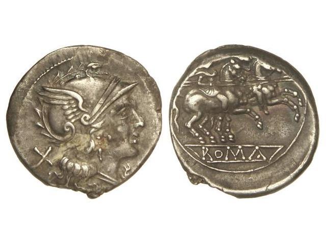 Denario. 200-190 a.C. ANÓNIMO-2. (Manchas en anverso. Reverso descentrado). Cal-1; FFC-7. MBC+.